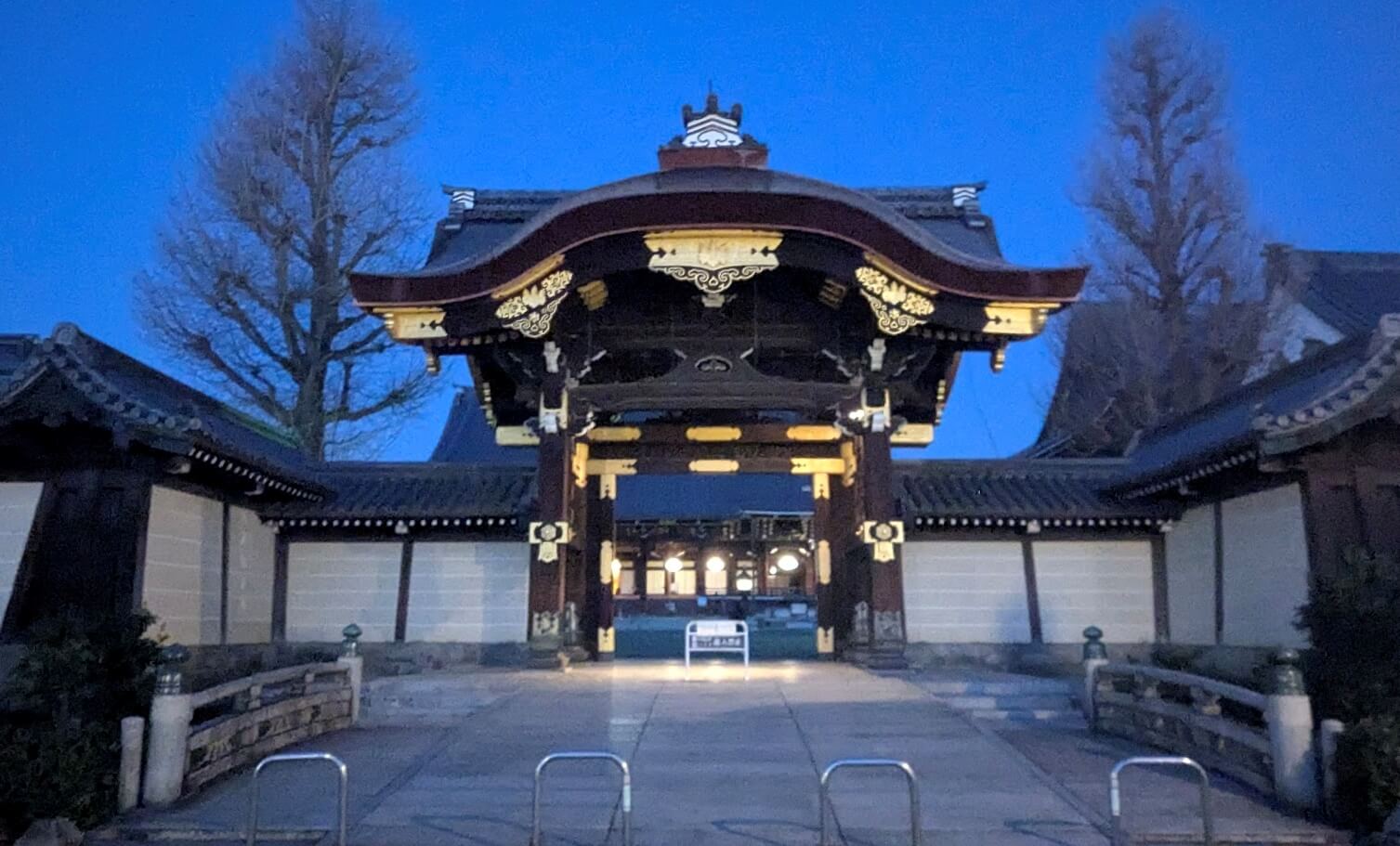 早朝5:30、群青色の空を背にした唐破風の美しい門